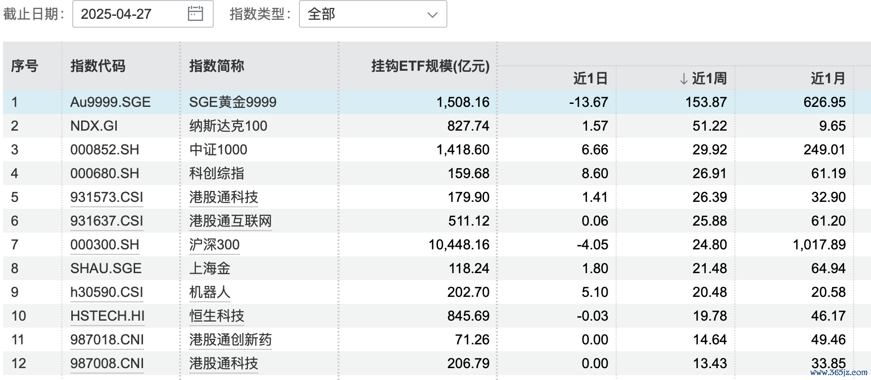 第一财经记者据Wind统计显示,截至4月27日,全市场1149只ETF基金总规模达4.07万亿元,当周新增521.8亿元,黄金、纳斯达克100、港股科技等主题ETF成吸金主力。