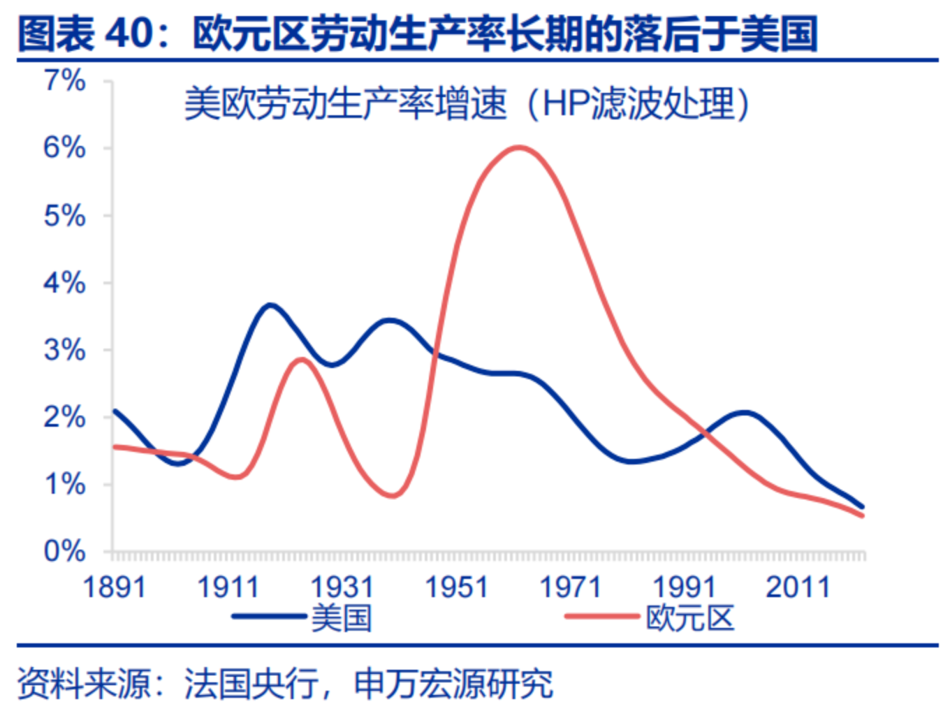 欧元区劳动生产率增速自2000年以来显著落后于美国。研发支出是核心问题。美欧固定资本形成占GDP比重不相上下,但是欧洲国家企业研发投资占GDP比重不但落后于美国,还低于日本,欧洲国家政府研发投资力度也弱于美国。与此对应的是,在2024年欧央行前行长德拉吉的报告中,将增加研发开支、提升竞争力作为核心,给出了欧盟每年需新增投资8000亿欧元的建议。