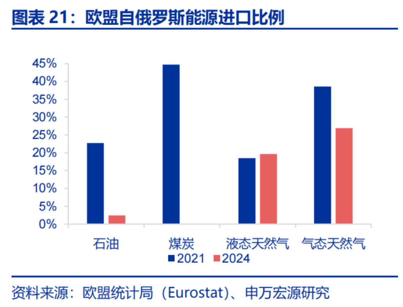 过去几年,俄乌冲突对于欧洲经济冲击主要缘于能源供给。欧洲对于俄罗斯能源的依赖度较高,2021年,欧盟气态天然气、液态天然气、石油、煤炭进口来自于俄罗斯的比重分别为38.6%、18.5%、22.7%、44.7%。