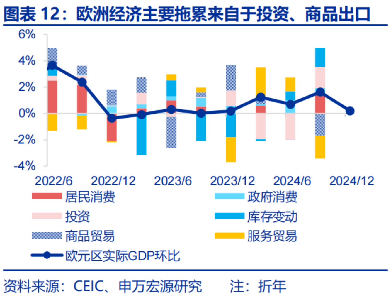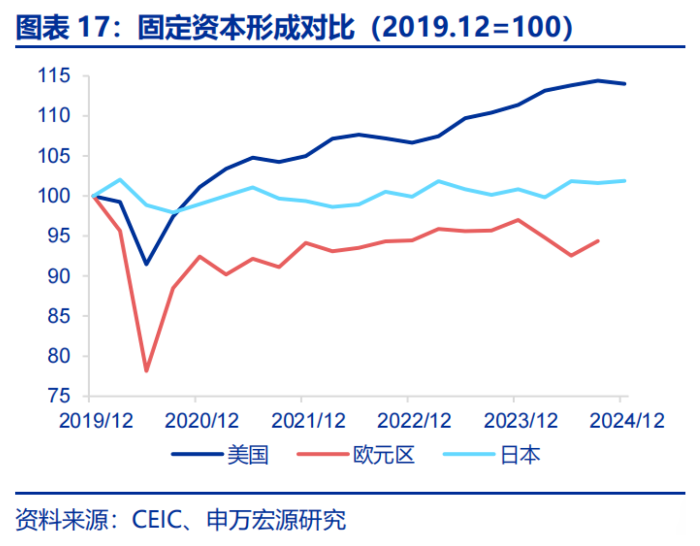 相比海外发达国家,欧洲经济的核心痛点在投资。投资方面,欧元区自疫情以来远弱于日本,2022年后差距甚至有所加大。2024年三季度,欧元区固定资本形成仅相当于疫情之前94%的水平,而美国在2024年四季度则达到疫情前的114%。