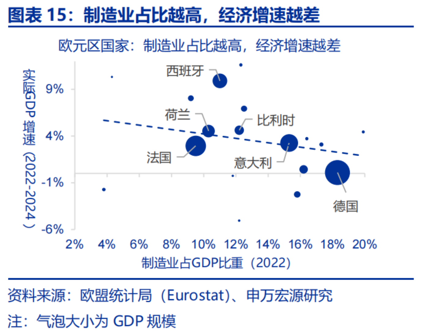 工业的走弱,导致欧元区经济内部国别分化。自2022年以来,德国经济成为欧洲经济拖累,反而是西班牙等依赖服务业、旅游业的国家经济在疫情改善之后表现较好。2022年以来,制造业增加值占比越高的国家,工业信心下降幅度越大、经济增速表现越差。
