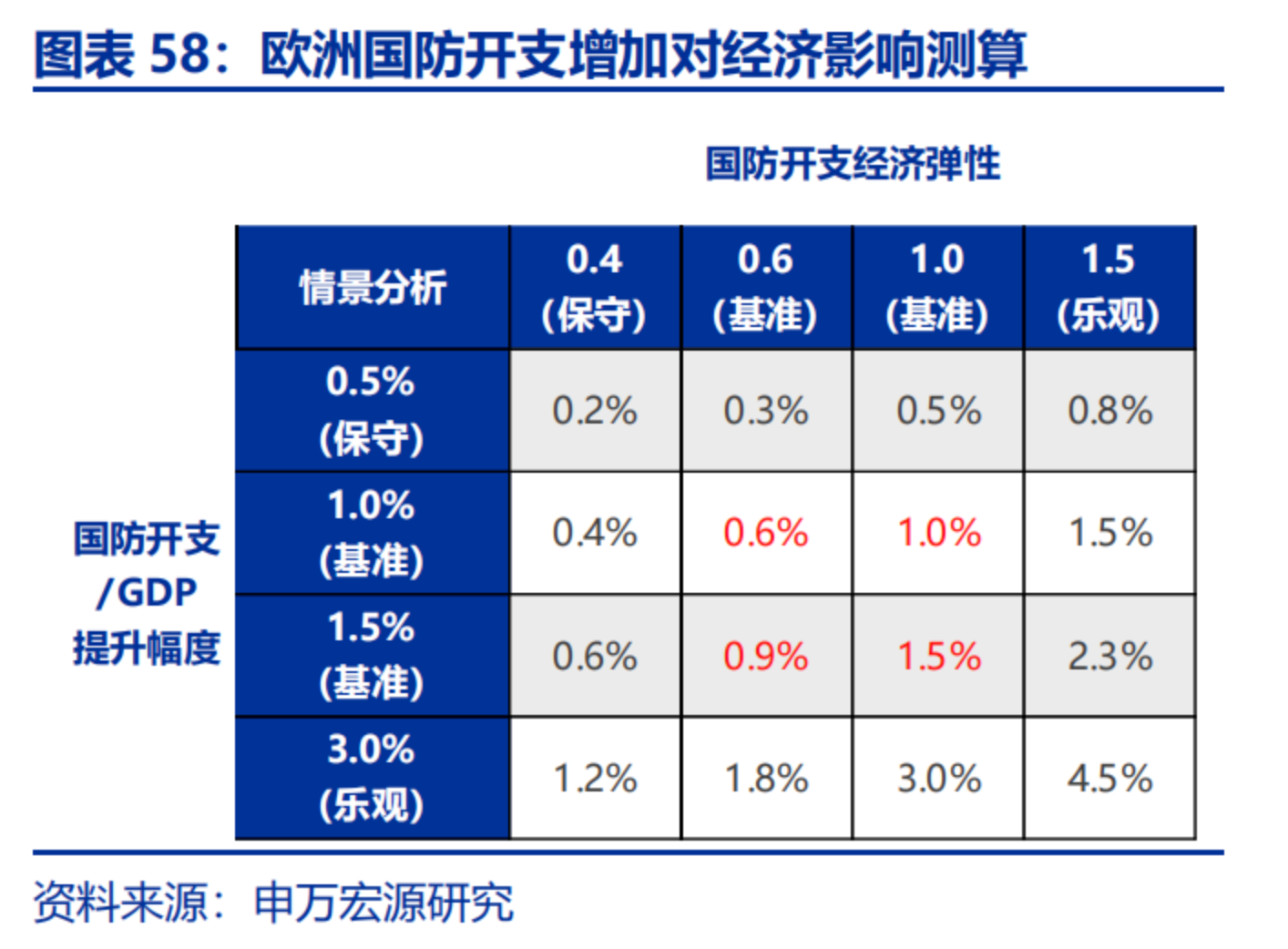 基准情形下,若欧洲国防军费开支占GDP比重提升1.0%~1.5%,可能对经济形成0.6%~1.5%的增速提升。根据上世纪60年以来历史经验,美国、欧元区军费开支占GDP比重与经济增速呈现正相关,但其效果从长期来看一般弱于基建。我们定义欧洲国防支出占GDP比重提升0.5%~2.5%为保守情形,提升1.0%~1.5%至3%~3.5%为基准情形(北约、布伦盖尔研究所),提升3%~5%为乐观情形(特朗普要求)。
