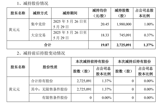 2025年5月26日至5月29日,黄元元分别通过集中竞价和大宗交易的方式完成减持计划,合计减持2,725,091股,占公司总股本的1.37%,套现总金额约54,148,518.03元。